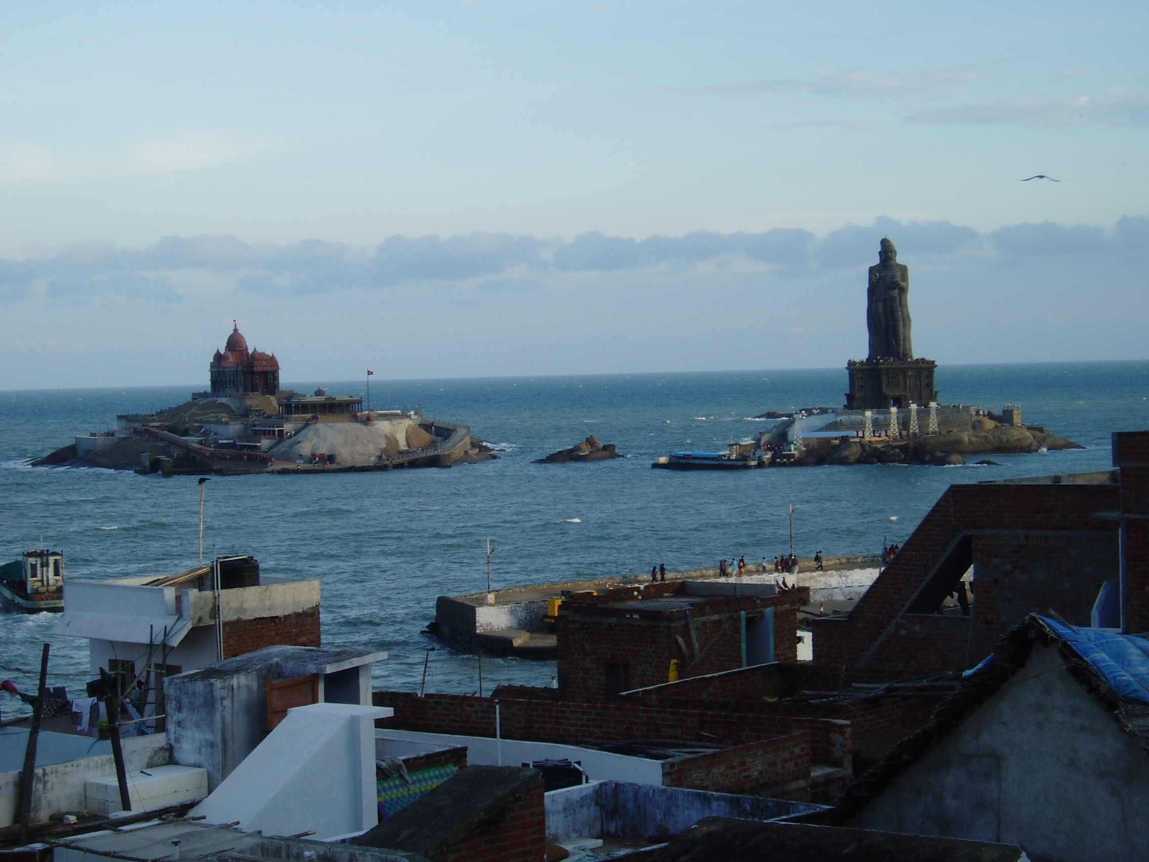 - Tagebucheintrag zum Grund meines Besuchs in Kanyakumari: “Auf der Dachterrasse meiner Unterkunft stand ich ca. mit drei Dutzend Indern und zahllosen weiteren auf den umliegenden Dachterrassen und starrte in den Himmel, beschallt von einem über Lautsprecher übertragenen “Gottesdienst” und harrte der Dinge, die da kamen: ein Sonnenaufgang über Indiens südlichstem Zipfel, wo sich ein Ozean und zwei Meere treffen.”